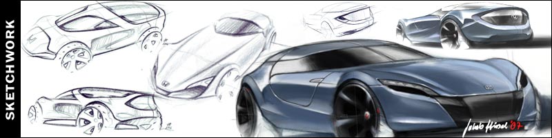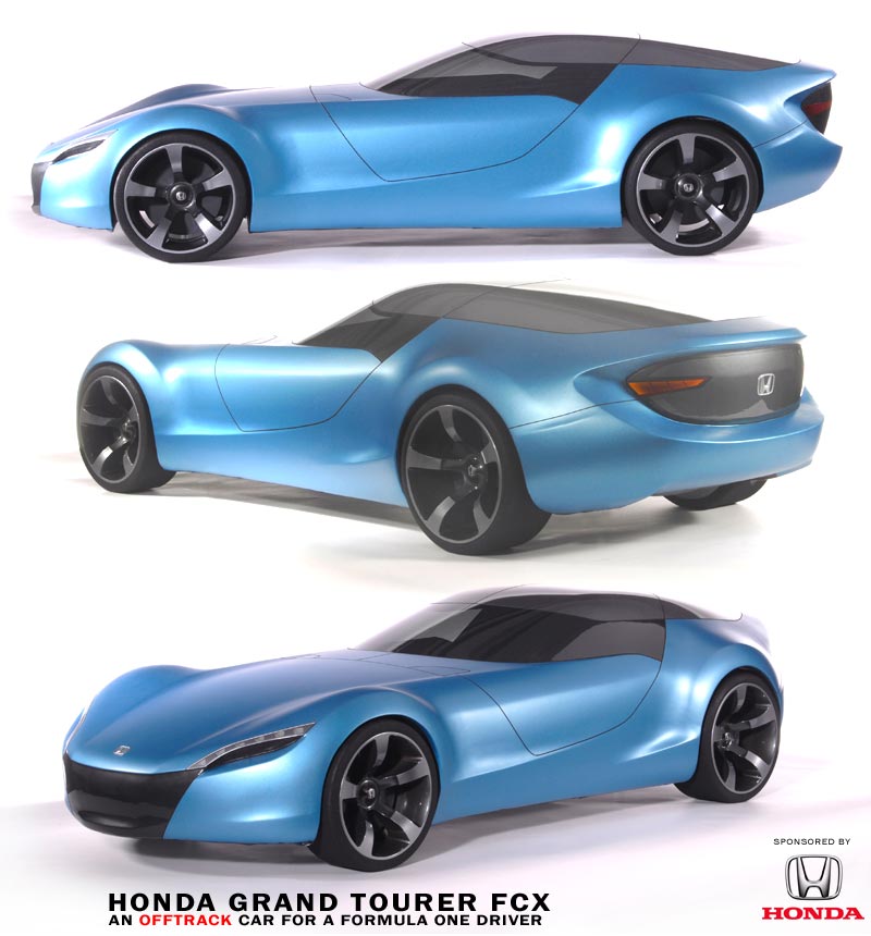 The concept I chose to design a car for Jenson Button. After a lot of research, I created a concept of a vehicle, specially taylored for the younger pilot in the Honda team. He might want to enjoy his leisure time in a big sporty car, in which he can drive along the côte d'azur coastal roads around Monaco with friends, or have a city trip to the casino. Most important, the car should be a strong and beautiful sculpture with a simple yet sexy body, but on the other hand should still be realistic to be produced as a real road car. The car should be outstanding in its proportions, with a long bonnet and cab-rearward styled cabin. The lounge sofa in the back and a lifting roof are inspired by classic yacht boats. |