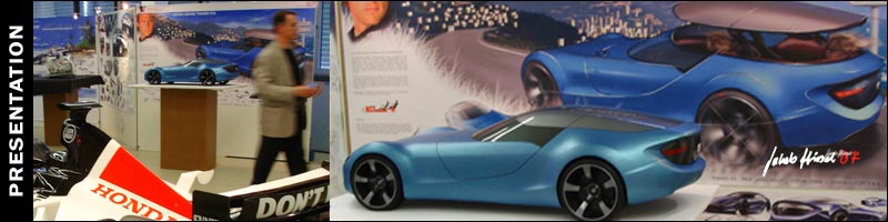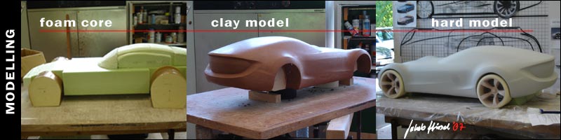 At that time, the World Soccer Championship took place in Germany, and although everyone else was watching the games on public viewings or driving around in fan corsos, the students of the Transportation Design department were still working hard all day in the modelling workshop, having just a small tv running and being nourrished by fast food and instant coffee... After the clay model was finally finished, I made a negative mould of gypsum and glass fibre, in which the actual model was laminated with glass-fiber reinforced plastic. Then I had to sand and refine it for painting. The model was painted with a very unique flat metallic paint. The presentation was a huge success for most of us who had been working so hard on this project for months. In conclusion, I am satisfied with the result. Although you always see a lot of mistakes or things necessary to refine afterwards, I think it was worth the effort, and I learned a lot during the design process of this project. It definately was a good experience for me. |